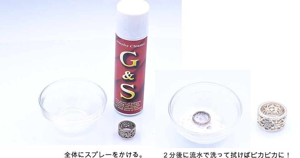 色々試したのですが、一番簡単に複雑なデザインのジュエリーも綺麗にできるのが、【G&S】というジュエリークリーナーです。