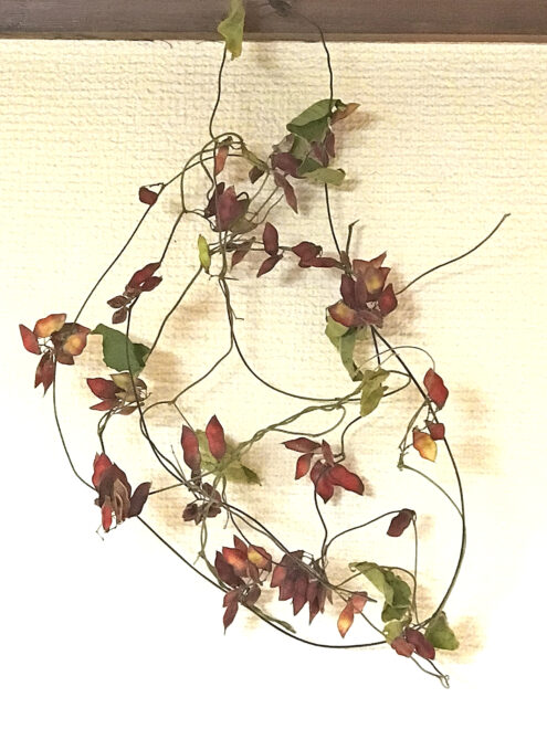 その中でも真っ赤な莢と中から飛び出す艶やかな黒豆が可愛らしいトキリマメを飾ってみましたのでご紹介します。