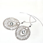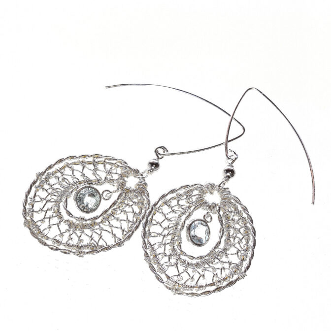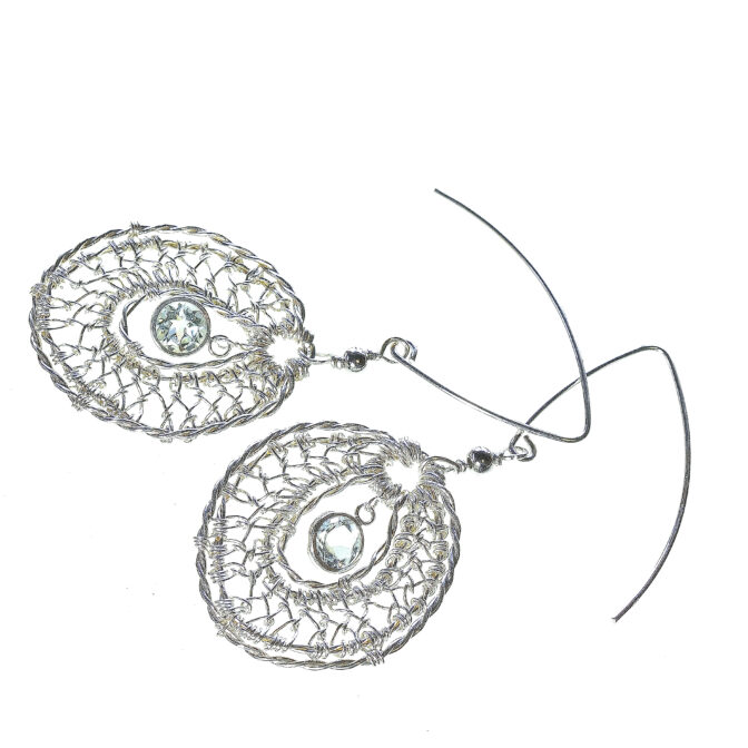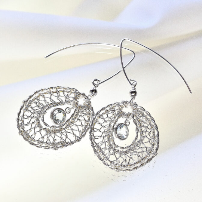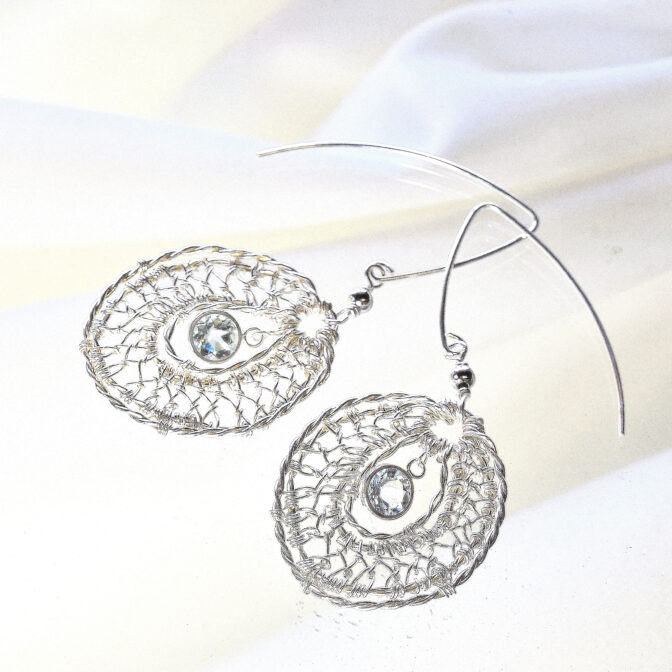 こちらは透かし模様の中に天然石アクアマリンが揺れるデザインです。